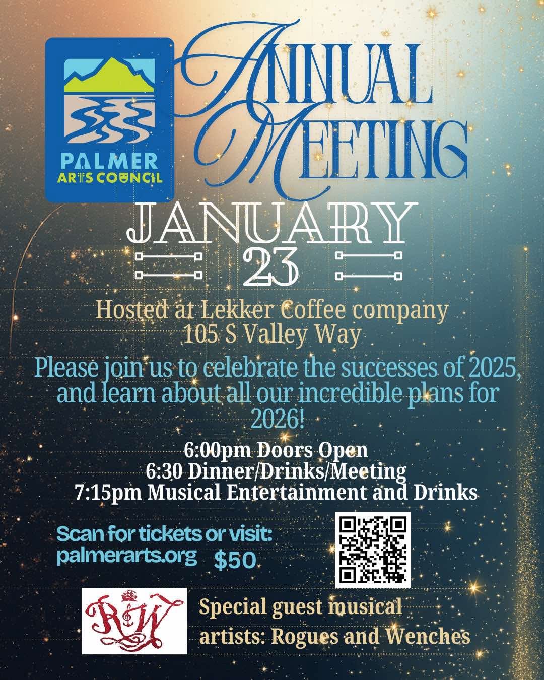 Join the Palmer Arts Council to celebrate all our 2025 successes and learn about all the exciting things we have planned for 2026! The evening will be hosted by the amazing Lekker Coffee and Baking company located at 105 S. Valley Way. Doors will open at 6:00 pm for social time with drinks available. The […]